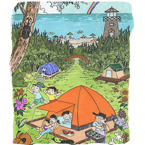 海辺の森キャンプ場には、テントサイト43区画(うち常設テント8区画)、炊事棟4棟を用意しています。屋内施設「つどい棟」は、雨天時にも団体活動を可能とする、「つどいのホール」や「談話室」を用意しています。また「管理棟」の温水シャワーが使用できます。常設テントを利用すれば、テントがなくてもキャンプの醍醐味を楽しめます。