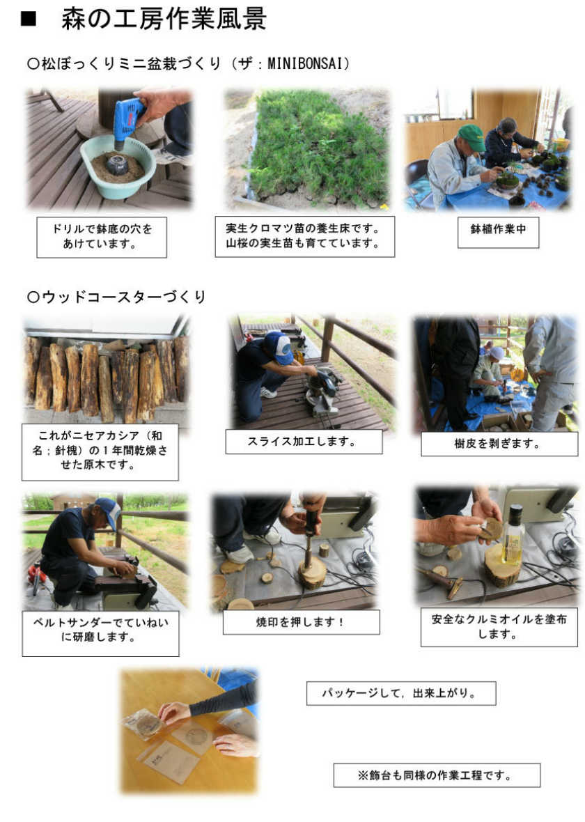 針槐(ニセアカシア)の木を使ってウッドコースターと飾り台を作ってみませんか?コースターは海辺の森オリジナルのかわいい焼印付き。製作時間は約2時間、ワンコインでできます!